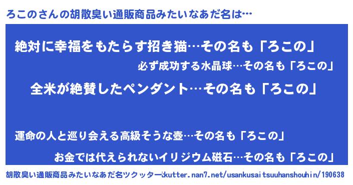 | 意味不明あだ名 | 『とにかく怪しいろこの』 |