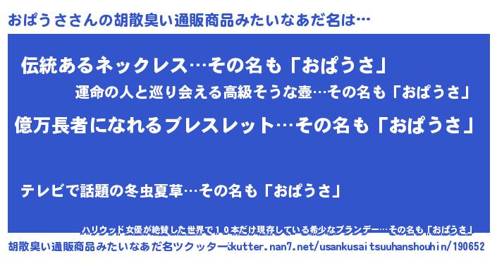| 男性向けラノベタイトル風あだ名 | 『オパウサアートオンライン』 |