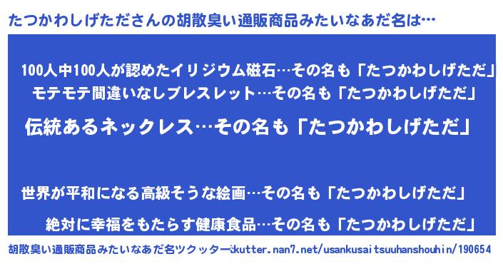 | 男性向けラノベタイトル風あだ名 | 『たつかわしげただの嫁は女の子じゃないと思った?』 |