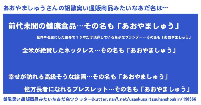 | 男性向けラノベタイトル風あだ名 | 『あおやましゅうに滅ぼされるだけの簡単なお仕事です』 |