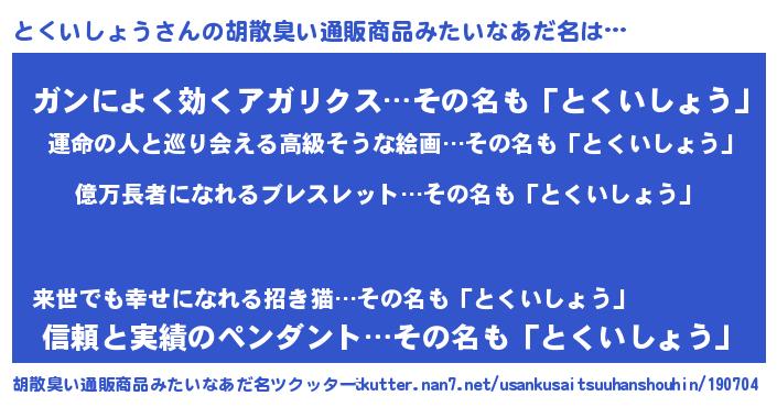とくいしょうさんの胡散臭い通販商品みたいなあだ名をツクッター!