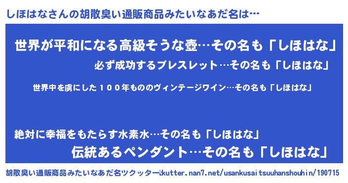 | ヒーロー風カッコイイあだ名 | 『仮面シホダー』『ウルトラしほはなマン』 |