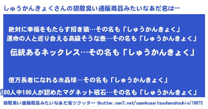 | 意味不明あだ名 | 『とにかく怪しいしゅうかんきょく』 |