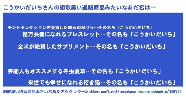 | 男性向けラノベタイトル風あだ名 | 『こうかいだいち~年齢イコール彼女いない歴の魔法使い~』 |