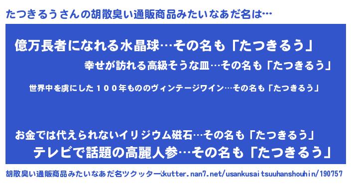 | 男性向けラノベタイトル風あだ名 | 『転生したらたつきるうだった件』 |