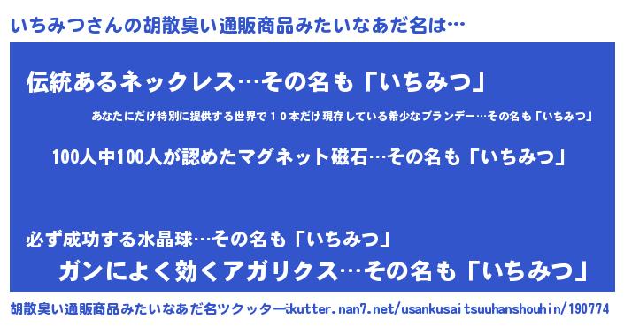 | ヒーロー風カッコイイあだ名 | 『正義の使者いちみつ』『魔戒騎士イチ』 |