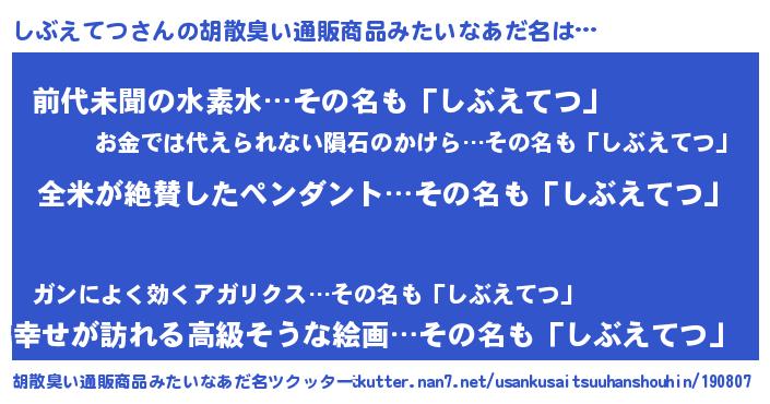 | 意味不明あだ名 | 『とにかく怪しいしぶえてつ』 |