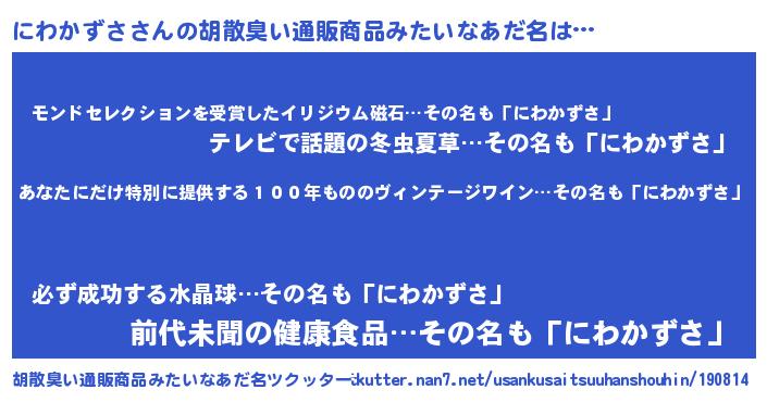 | 意味不明あだ名 | 『住所不定無職にわかずさ(5歳)』 |
