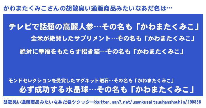 | 男性向けラノベタイトル風あだ名 | 『かわまたくみこという概念が存在しない退屈な世界 』 |
