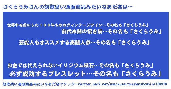 | 男性向けラノベタイトル風あだ名 | 『さくらうみ~年齢イコール彼女いない歴の魔法使い~』 |