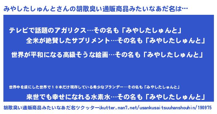 | 男性向けラノベタイトル風あだ名 | 『転生したらみやしたしゅんとだった件』 |