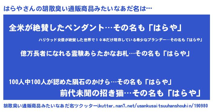 | 意味不明あだ名 | 『ペロリンはらや』『永久保存はらや』 |