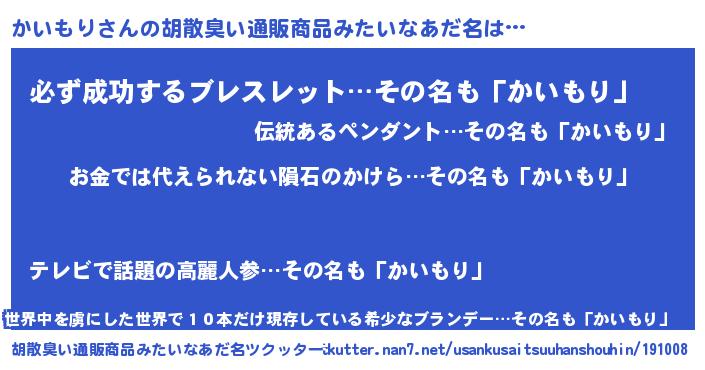 | 男性向けラノベタイトル風あだ名 | 『おまえをオタクにしてやるから、俺をかいもりにしてくれ! 』 |