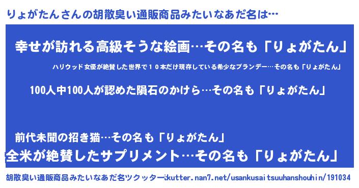 | 男性向けラノベタイトル風あだ名 | 『おまえをオタクにしてやるから、俺をりょがたんにしてくれ! 』 |