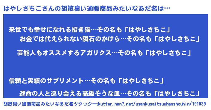 | 意味不明あだ名 | 『自称はやしさちこ』 |