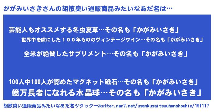 | 欧米人風あだ名 | 『ウサインかがみいさき』 |