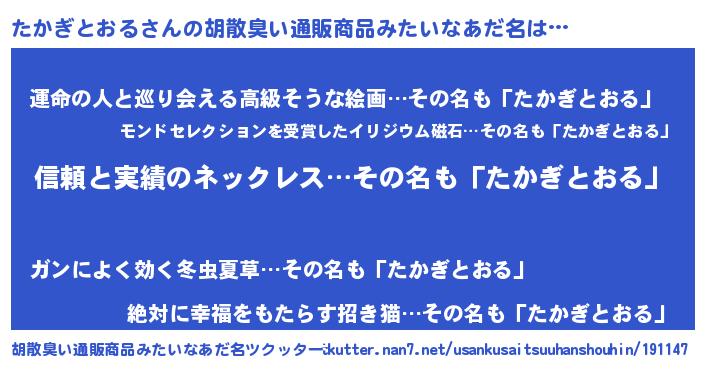 | 肩書あだ名 | 『たかぎとおる塾長』『たかぎとおる船長』 |