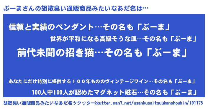 | ヘコむあだ名 | 『ぶーま(笑)』『ぶーお』『酢こんぶ』 |