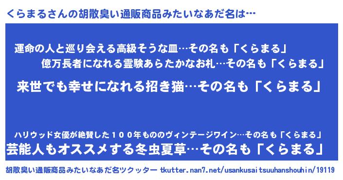 | 男性向けラノベタイトル風あだ名 | 『くらまるという概念が存在しない退屈な世界 』 |