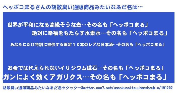 | 意味不明あだ名 | 『住所不定無職ヘッポコまる(40歳)』 |
