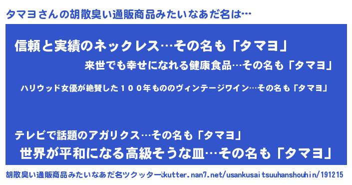 | 男性向けラノベタイトル風あだ名 | 『魔弾の王とタマヨ』『タマヨスレイヤー』 |