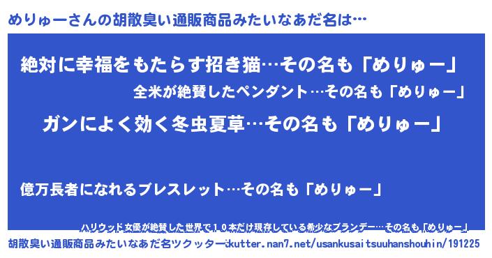 | ヘコむあだ名 | 『めりゅー(遠い目)』『めりを』 |