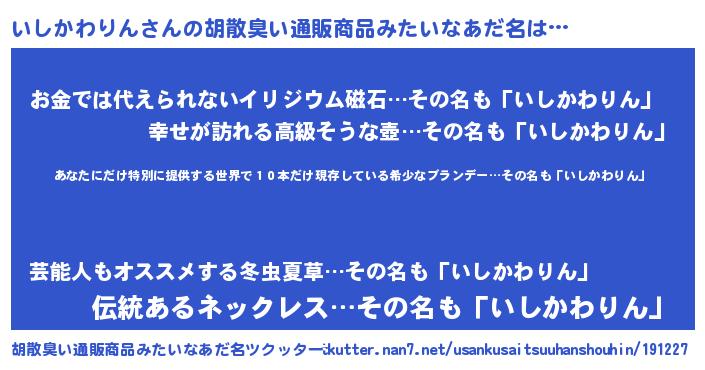 | 男性向けラノベタイトル風あだ名 | 『この素晴らしい世界にいしかわりんを!』 |