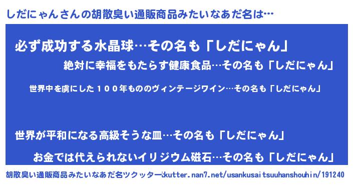 | 意味不明あだ名 | 『住所不定無職しだにゃん(3歳)』 |