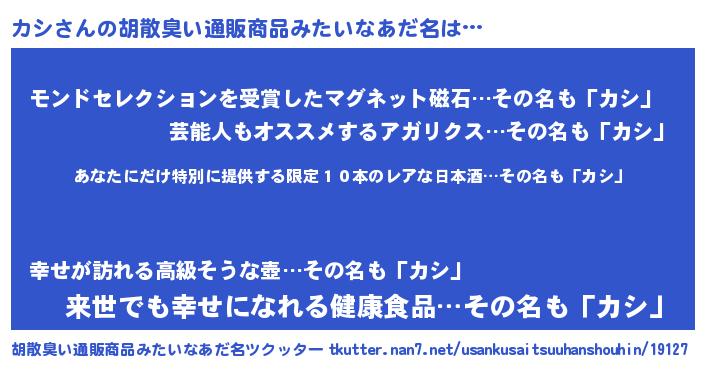 | 意味不明あだ名 | 『住所不定無職カシ(39歳)』『永久保存カシ』 |