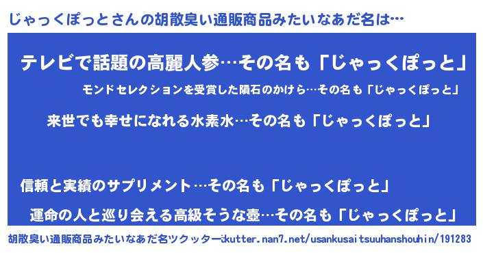 | 男性向けラノベタイトル風あだ名 | 『じゃっくぽっとという概念が存在しない退屈な世界 』 |