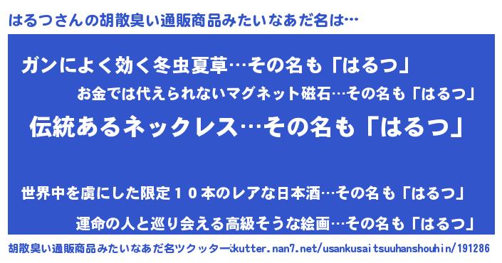 | 意味不明あだ名 | 『とにかく怪しいはるつ』『自称はるつ』 |