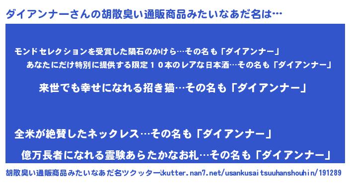 | 男性向けラノベタイトル風あだ名 | 『ダイアンナーに滅ぼされるだけの簡単なお仕事です』 |