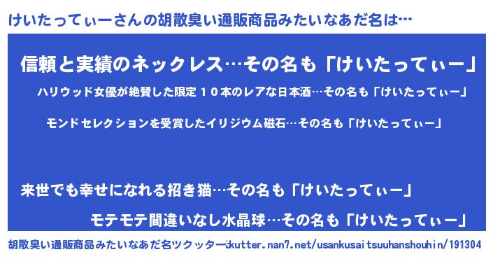 | 男性向けラノベタイトル風あだ名 | 『ノーゲーム・ノーケイタッティー』 |
