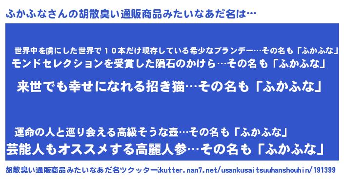 | 男性向けラノベタイトル風あだ名 | 『誰もが恐れるあのふかふなが、ぼくの専属メイドになるようです。』 |