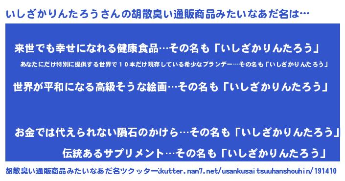 | 男性向けラノベタイトル風あだ名 | 『転生したらいしざかりんたろうだった件』 |