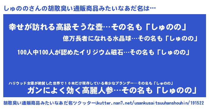 | 意味不明あだ名 | 『しいたけ科しゅのの属』『自称しゅのの』 |