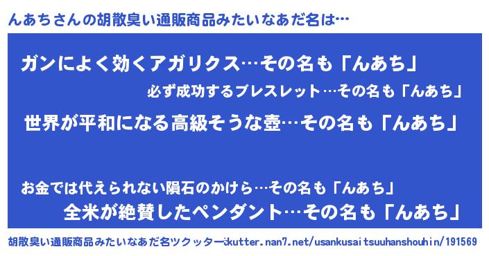 | 男性向けラノベタイトル風あだ名 | 『転生したらんあちだった件』 |