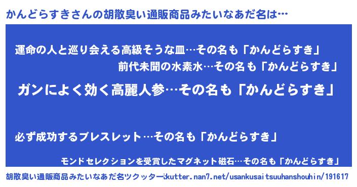 | 意味不明あだ名 | 『自称かんどらすき』 |