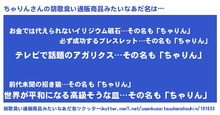 | 意味不明あだ名 | 『自称ちゃりん』『めかぶ科ちゃりん属』 |