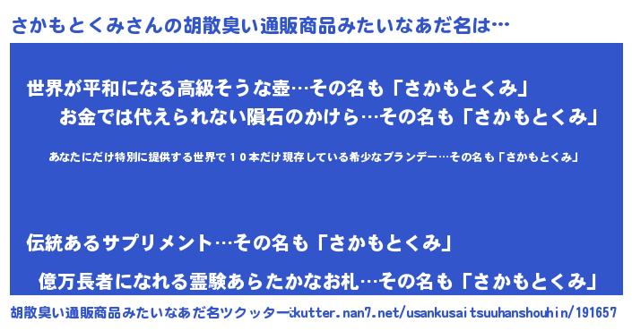 | 男性向けラノベタイトル風あだ名 | 『さかもとくみ~年齢イコール彼女いない歴の魔法使い~』 |