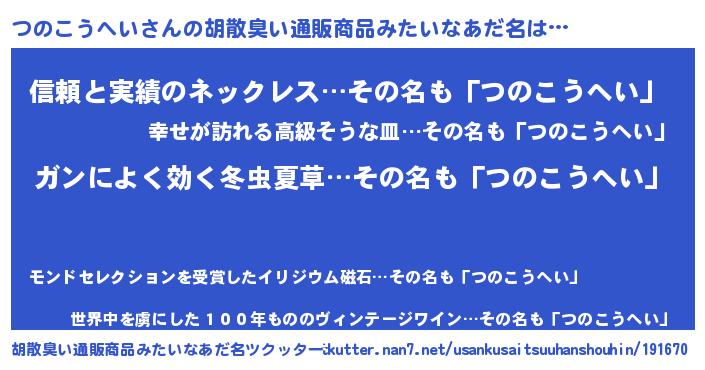 | 女子向けラノベタイトル風あだ名 | 『つのこうへいなんてお断りですっ。』 |