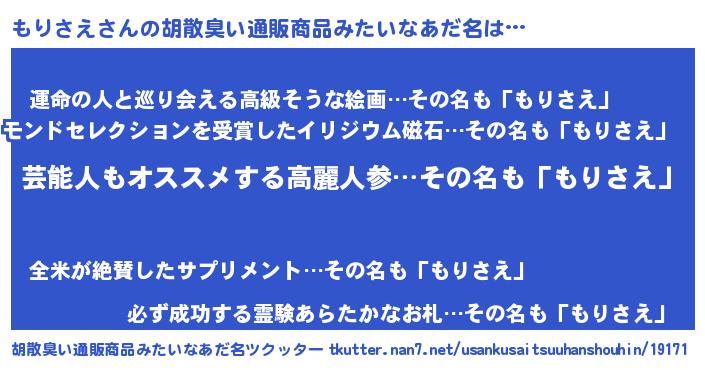 | 意味不明あだ名 | 『ヨモギ科もりさえ属』『自称もりさえ』 |