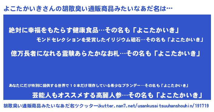 よこたかいきさんの胡散臭い通販商品みたいなあだ名をツクッター!