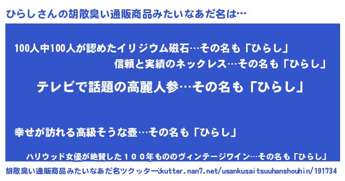 | 男性向けラノベタイトル風あだ名 | 『Re:ひらしから始める異世界生活』 |