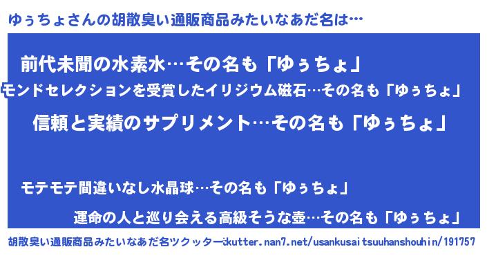 | 男性向けラノベタイトル風あだ名 | 『ダンジョンにゆぅちょを求めるのは間違っているだろうか』 |