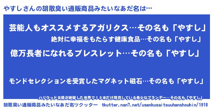 | 意味不明あだ名 | 『ペロリンやすし』『自称やすし』 |