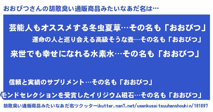 | 男性向けラノベタイトル風あだ名 | 『おおびつという概念が存在しない退屈な世界 』 |