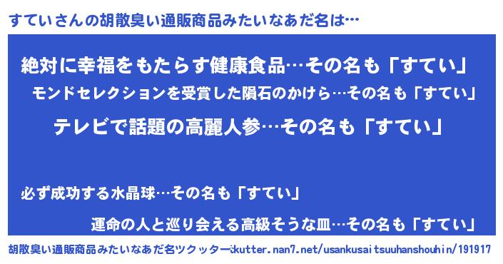 | 意味不明あだ名 | 『自称すてい』『永久保存すてい』 |