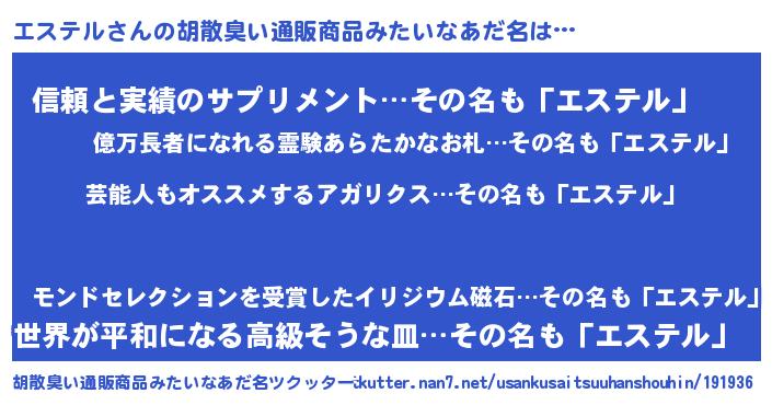 | 意味不明あだ名 | 『自称エステル』『エステルフォーエバー』 |