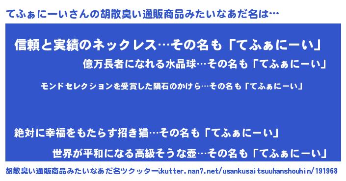 | 男性向けラノベタイトル風あだ名 | 『てふぁにーい~年齢イコール彼女いない歴の魔法使い~』 |